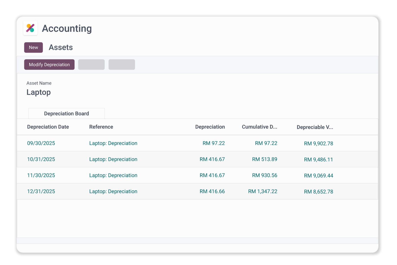 - Significantly reduce manual work and human errors by allowing asset values to be written off automatically by each month or year.